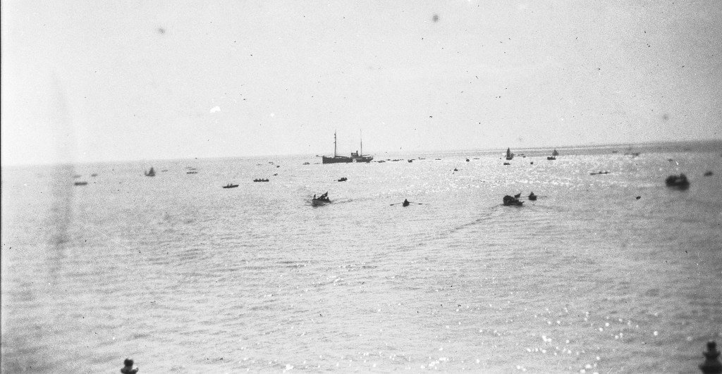 My Grandmother, Bessie Gordon saw the Quest off Eastbourne and took this photo of the ship surrounded bt rowing boats.