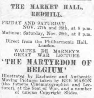 He returned to England with 4,000 feet of film of the war. Before a lecture at the Pier Theatre at Eastbourne in December 1914, the Eastbourne Gazettereported him as declaring “My nerves are shot to pieces but I suppose I should consider myself lucky to have reached England at all, for on more than one occasion I though my last hour had come. I have been with the Belgian troops all the time, for no cameramen are allowed with the British or French armies. Strictly speaking, I should not have taken films but the Belgian officers proved very tolerant towards me.” At subsequent lectures he apeared dressed in khaki. At Torquay his war footage was accompanied by a local orchestra playing the 1812 Overture.