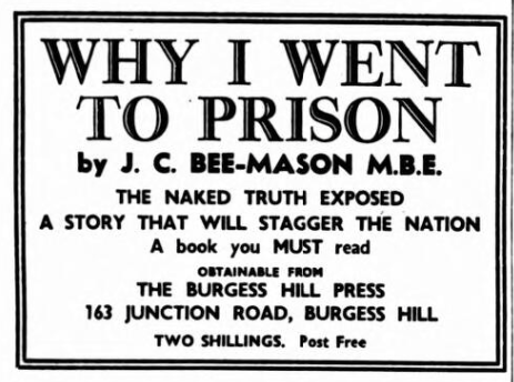 Bee-Mason was a Burgess Hill Councillor but was outspoken and often at loggerheads with his fellow councillors. The local press reported that he was ‘often in hot-water due to his behaviour’. At a council meeting on April 1952 he objected to ‘the scandalous allocation of council-houses in Burgess Hill’ and to make his point hammered on a desk with a block of wood. He refused to desist and when he refused to leave the meeting, the police were called and he was arrested. He appeared later at Haywards Heath Magistrates Court and intended to plead ‘not guilty’ however he suddenly became bewildered and pleaded ‘guilty’ instead. He was bound over to keep the peace but the truculent councillor refused to agree and, as a result, was sentenced to two months imprisonment.