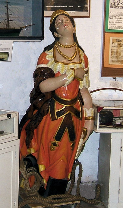 Seaford Museum has a ship’s figurehead which is said to have come from the Peruvian and she certainly looks like a South American princess. She wears gold and feathers and is holding a fan in one hand and a fruit (maybe a lemon) in her other.