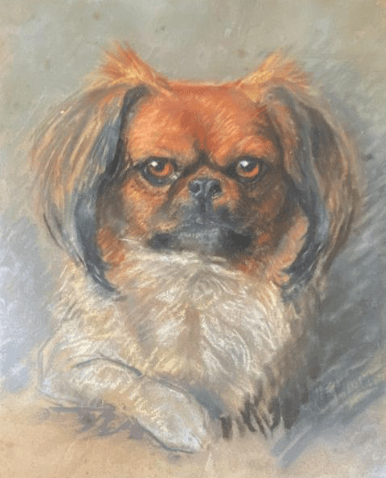 Pimm knew Eastbourne author John Jeffrey Farnol (1878-1952) indeed it could be that the two became friends when they both lived in London as Farnol was also an artist and had attended the Westminster School of Art (maybe the two ice-skated together!) Farnol had moved to 14, Denton Road, Eastbourne in 1910 and became noted as the author of many romantic novels. Pimm painted his friend’s grumpy looking pug (who went by the unlikely name of ‘Woggins Wiggery-Wag’. There is now a blue plaque at the house in Eastbourne where Farnol and Wiggery-Wag lived’.