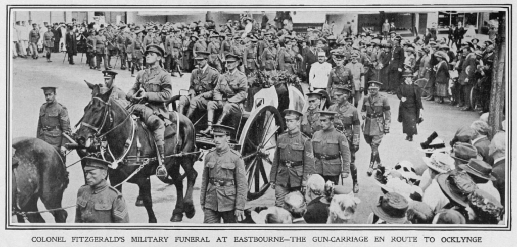 The King and the governments of Italy, Russia and France were all represented. It took two carriages to convey wreaths from the church to the cemetery where they were laid on the grave. 300 men from the King’s Royal Rifles based at Seaford attended the cemetery to provide a firing party. Fitzgerald was buried next to his father who had died in 1912. A short piece of Pathe Newsreel showing the funeral can be viewed on line.
