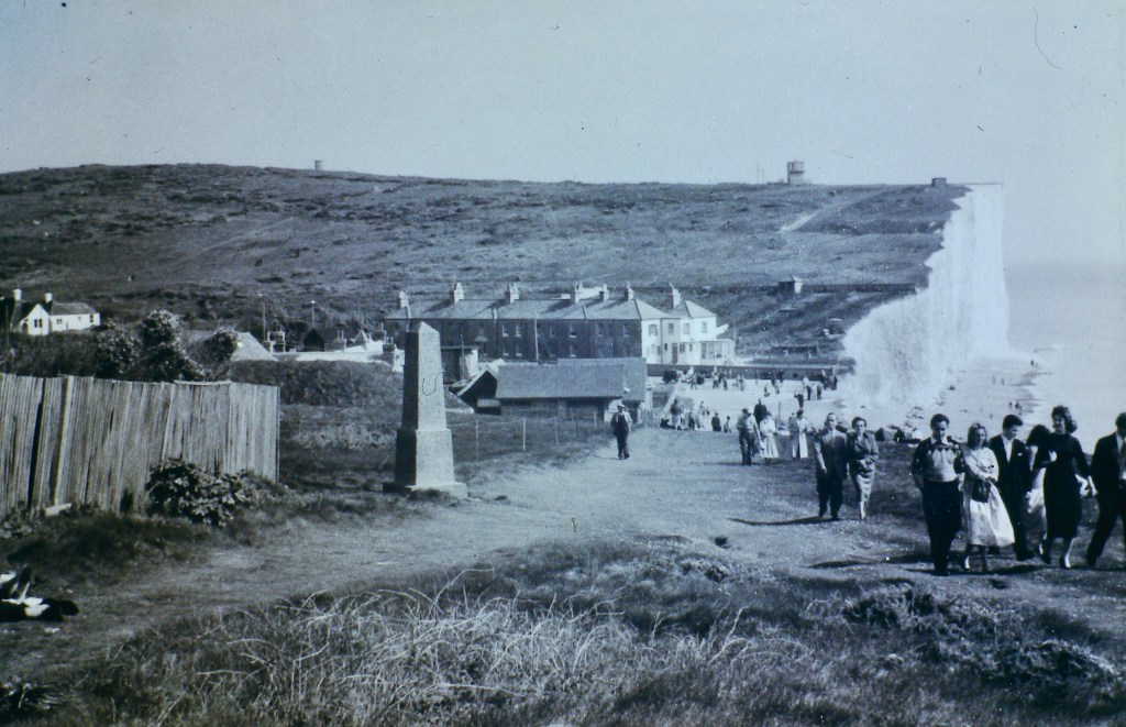 When my great uncle took the photos, the Robertson memorial was close to the cliffs on Went Hill to the west of Birling Gap however the cliffs here have eroded over the years so the Robertson Monument was moved further west, between two of the iconic Seven Sisters at Michel Dean. This removal probably happened in the late 1960s or early 1970s as this photo was taken in 1965. The path where monument and the jolly walkers are has now fallen into the sea.