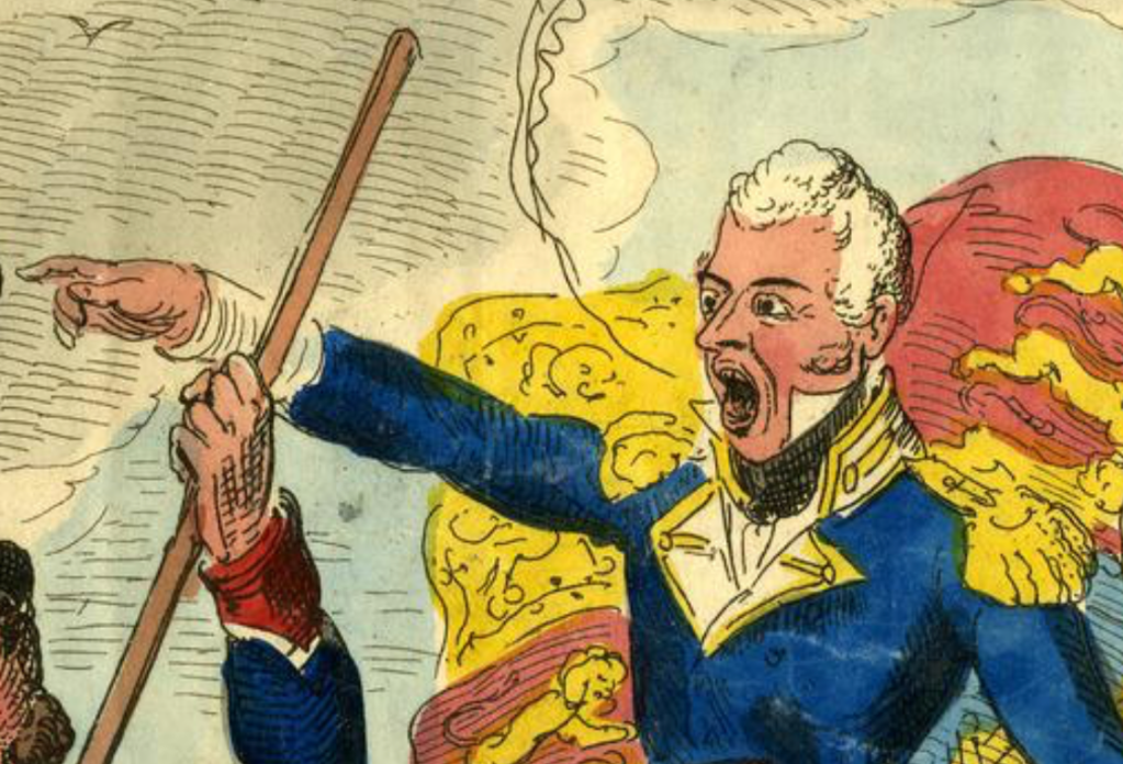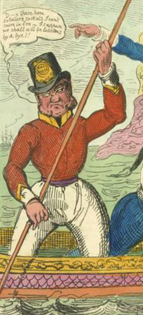 The Prince Regent, dressed as a navy Admiral, is concerned about his foot as he is suffering from gout – note that his right foot is bandaged. His feet are being held by a sailor who doubts the Prince will fit in the boat. He is saying “My eyes jack! – this ‘ere craft will never carry him!” and calls for a reeve a tackle (rope and tackle) to assist. Captain Paget barks an order to the bargeman saying “Shove the barge further astern damn you!” commanding him to move the jolly boat further to help the prince. By the look on his face, the be-whiskered bargemen is clearly not impressed and complains about his tight, newly-issued soldier’s jacket saying he looks like a lobster. (In my print the jacket is coloured blue but in others it was painted in the correct colour – red.)