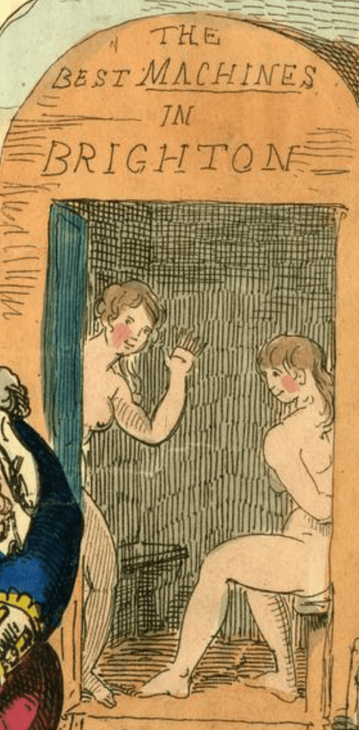 The colour-tinted print shows a sexually exhausted Prince Regent being carried from a Brighton bathing machine onto the jolly-boat of HMS Royal George. He has clearly had fun as the bathing machine contains two naked women and his left hand clutches the ample breast of a bathing-girl called Judy. She does not seem to mind, probably as she has been given the gift of the gold necklace which she is wearing.