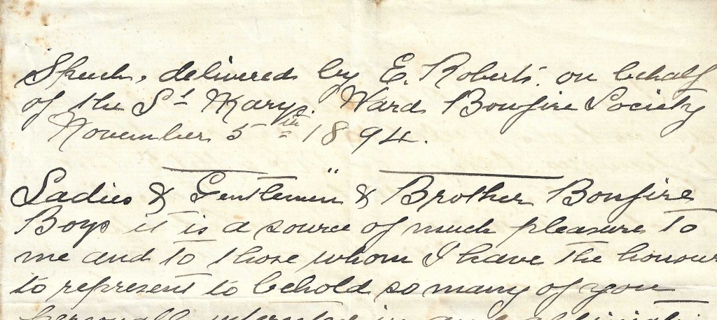 Ladies and gentlemen and brother Bonfire Boys, it is a source of much pleasure to me and to those whom I have the honour to represent, to behold so many of you, personally interested in and appreciating our efforts in keeping up the commemoration of the failure of the Gunpowder Plot, which, had it not been stayed by God’s providence by causing a letter to be sent to one of the Members of Parliament, it is supposed that about 3,000 persons who would have crowded into Parliament would have lost their lives by the explosion.
