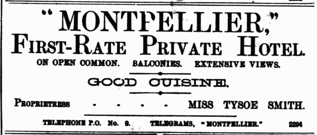 The business obviously flourished as the 1901 census shows the Montpelier Guest House is now listed as a hotel with no less than eight members of staff. In September 1901 the Llandrindod Urban District Council declined planning permission for ‘Miss Tyso-Smith’ to build a corrugated iron artist’s studio at her house. (Radnorshire Standard 18th September 1901)