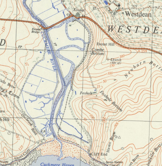 The Cuckmere River (never the River Cuckmere!) has always decided its own route to the sea. This map shows the various places where the mouth of the river has been since the eighteenth century. The map shows something else of interest, a thin black line at the top marked ‘Tramway’. Cuckmere Haven once had its own narrow-gauge railway.
