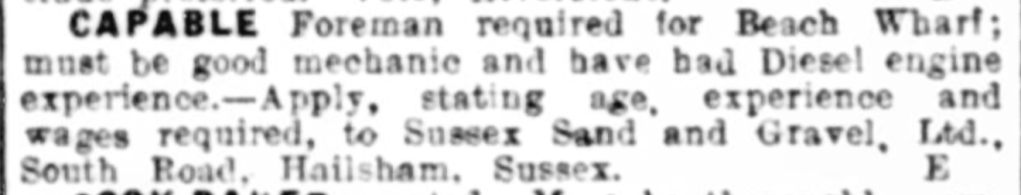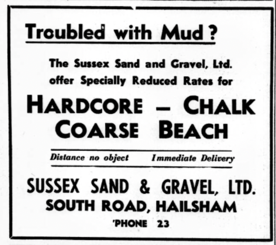 In March 1934, a new company was established at South Road, Hailsham by a Mr Frederick Hastings. The new company was named The Sussex Sand and Gravel Company and aimed to provide materials for building roads and buildings. Mr Hastings not only purchased the shingle from Cuckmere Haven but also bought out Alfred Smith’s Haulage business purchasing nine of Smith’s lorries. The next month they were advertising for a foreman to work at their ‘beach wharf’.