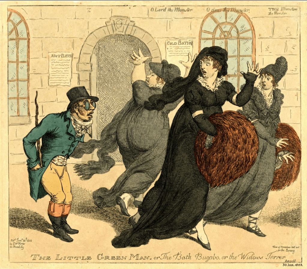 A 1802 engraving in the British Museum shows Henry as a short man with green tinted spectacles, terrifying widows who call him ‘the monster.