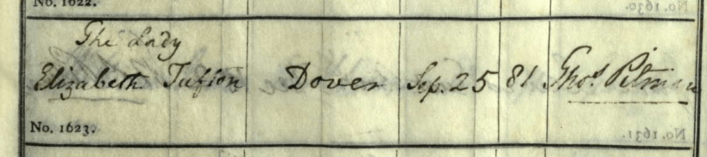 Again a check of the St Mary’s parish registers show just one likely candidate; on 25th September 1849, the Reverend Thomas Pitman buried Lady Elizabeth Tufton. The place of death is shown as Dover.