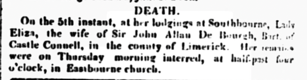 DEATH: On the 5th instant, at her lodgings at Southbourne, Lady Eliza, the wife of Sir John Allan De Bourgh, Bart of Castle Cornell in the county of Limerick. Her remains were on Thursday morning interred at half past four o’clock in Eastbourne Church.