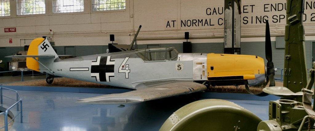 I learnt that this was a Messerschmidt Bf 109 E-3 aircraft which had been escorting and protecting larger bombers heading for London on 30th September 1940. It was being flown by a 22 year-old inexperienced pilot, Unteroffizier (Corporal) Horst Perez of Jagdgeschwader 26 Schlageter (JG26) which was a fighter-wing of the Luftwaffe. The unit was based near Calais and named after Nazi hero Albert Schlageter, who had been executed by the French in 1923. Each of the aircraft in the squadron were marked with a gothic-style letter S to commemorate him and this can still be seen on the aircraft at Duxford. This particular plane was called ‘White 4’ after the number on its side.