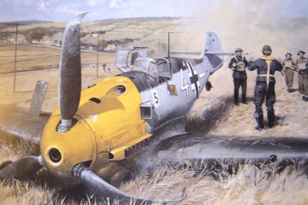 The exact reason why Unteroffizier Perez’s aircraft landed is not known. He claimed that the engine had failed but there are suspicions that he simply gave up and surrendered. I have read a theory that, as his surname ‘Perez’ is Spanish and not German he may not have been ‘accepted’ as a ‘true Arian’ by his colleagues. Whatever the reasons, he survived the crash as did his aircraft.