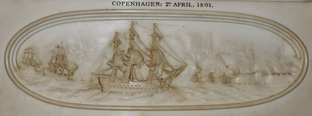 The marble memorial was erected by his widow and list some of his naval achievements including the names of some of the men he served under including Admiral George Rodney, Admiral Richard Howe, Admiral Adam Duncan, Admiral John Jervis (Earl Saint Vincent) and the “Immortal Nelson!” How unusual to see a memorial with an exclamation mark on it!