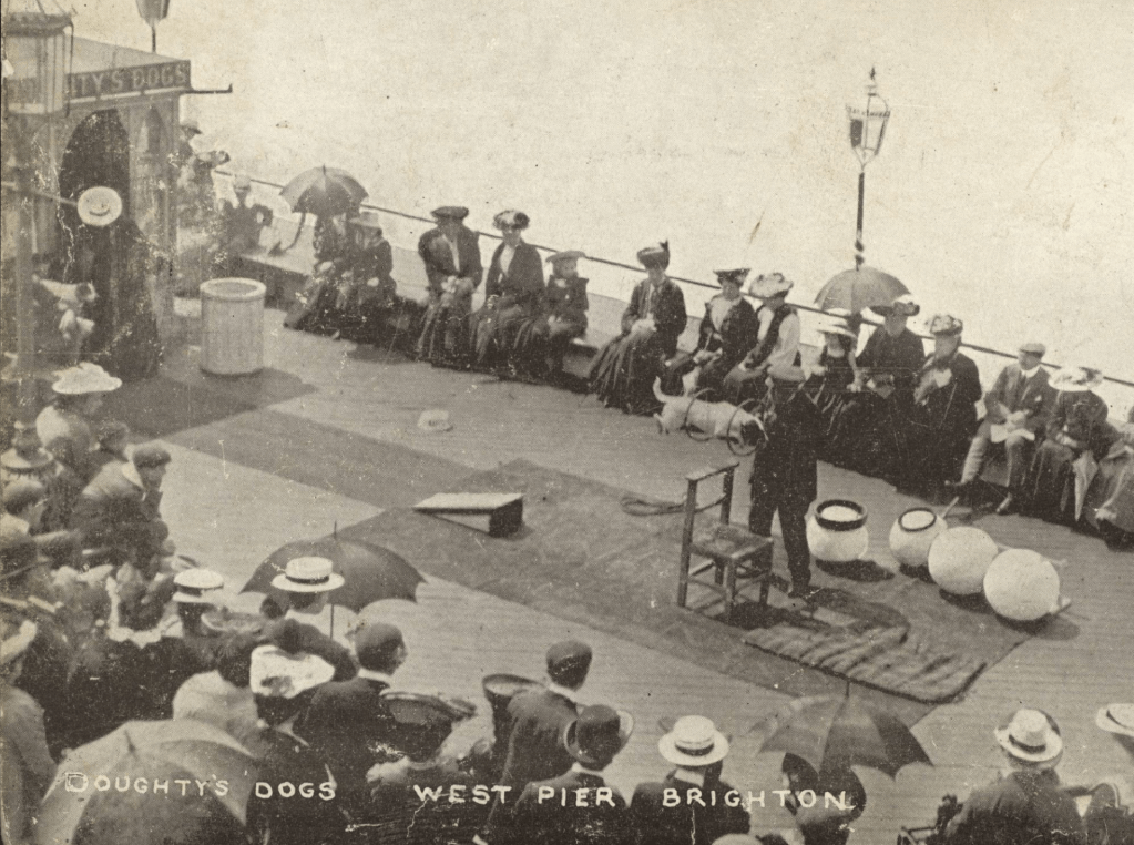 By 1901, James was 83 and his occupation on the census shown is ‘Pantomime Artiste.’ (oh yes it was!) Only he wasn’t retired – he kept performing and got a permit to perform on the West Pier with his trained dogs. Budding reporter, Dorothey Milner (aged 8) wrote to the Brighton Gazette in January 1901. She said “The pier has some amusing shows and you can see Mr Doughty’s dogs perform. The dogs are dressed as ladies and gentlemen and are most wonderful. They come around for money and biscuits. One wonderful dog jumps through a hoop and over Mr Doughty’s arm and does other wonderful things”