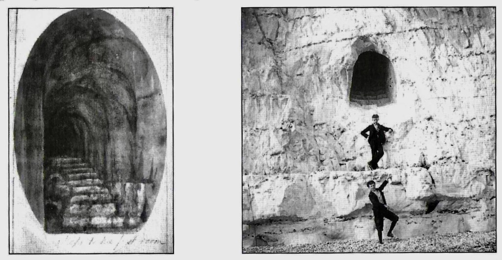 [Note: Darby’s Hole was named after Parson Jonathan Darby who became vicar of East Dean in 1706. He enlarged existing fissures to create a cave in the cliff, which was a refuge for shipwrecked sailors and during stormy nights also held a light to warn off ships. It is also said that he would use the caves as a refuge from his overbearing wife Anne!] [I am not sure what a celluloid collar was!]